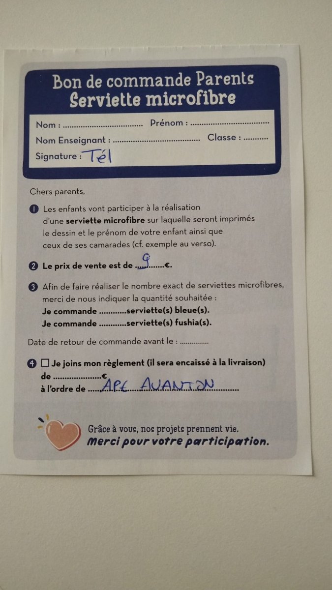 - via le cahier de liaison de votre enfant, avec votre règlement (espèces ou chèque à l’ordre de « APE d’Avanton ») ,